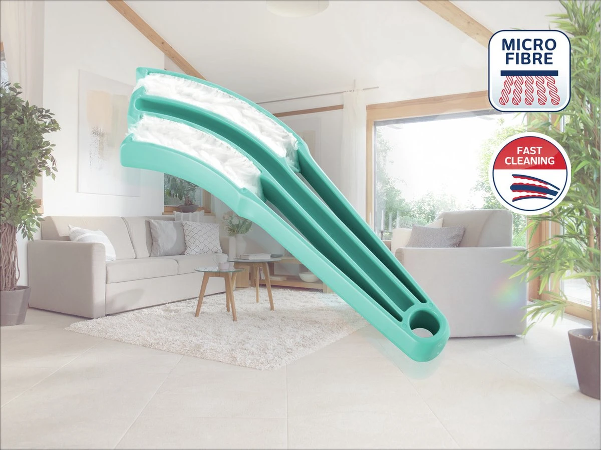 Jaloezieƫn reinigen is een lastige klus. Als lamellen vaak horizontaal hangen, zijn het echte stofvangers. En onaangename bronnen voor allergieƫn. De jaloezieƫnreiniger Jalousetta van Leifheit is de oplossing. Dankzij zijn speciale vorm omvat hij tegelijkertijd twee jaloezieƫn en reinigt zo vier vlakken met slechts ƩƩn veeg. De doek van microvezels trekt stof regelrecht aan en houdt het in zijn fijne vezels vast. Zo wordt voorkomen dat stofdeeltjes alleen maar worden weggeveegd en op een andere plaats weer op de grond vallen. Ook hardnekkig vuil, zoals vetafzettingen worden moeiteloos verwijderd door de fijne vezels, zonder daarbij te krassen op de kwetsbare oppervlakken. De Jalousetta is uitgerust met een ophangmogelijkheid om deze praktisch op te bergen. Leifheit biedt 3 jaar garantie.
