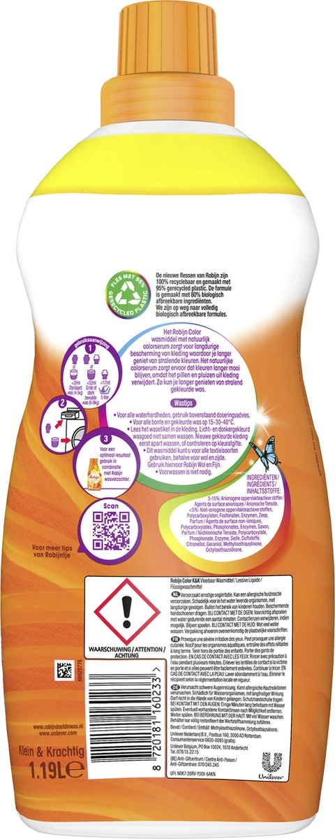 De verbeterde Robijn Color formule bevat 80% biologisch afbreekbare ingrediënten. We zijn op weg naar volledig biologisch afbreekbare formules. De vertrouwde effectiviteit en bekende geuren van Robijn, gecombineerd met de kracht van de natuur. Goed voor je kleding en beter voor de planeet. Bovendien zijn de flessen gemaakt van 95% gerecycled en 100% recyclebaar plastic. Op deze manier draagt Robijn bij aan een duurzamere manier van wassen.